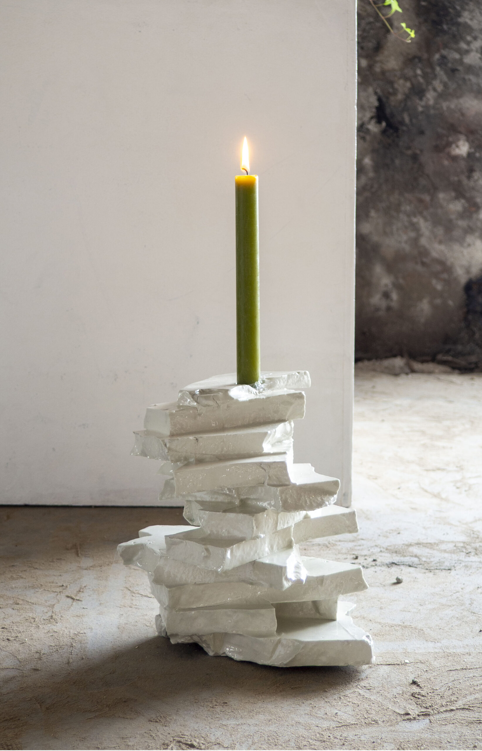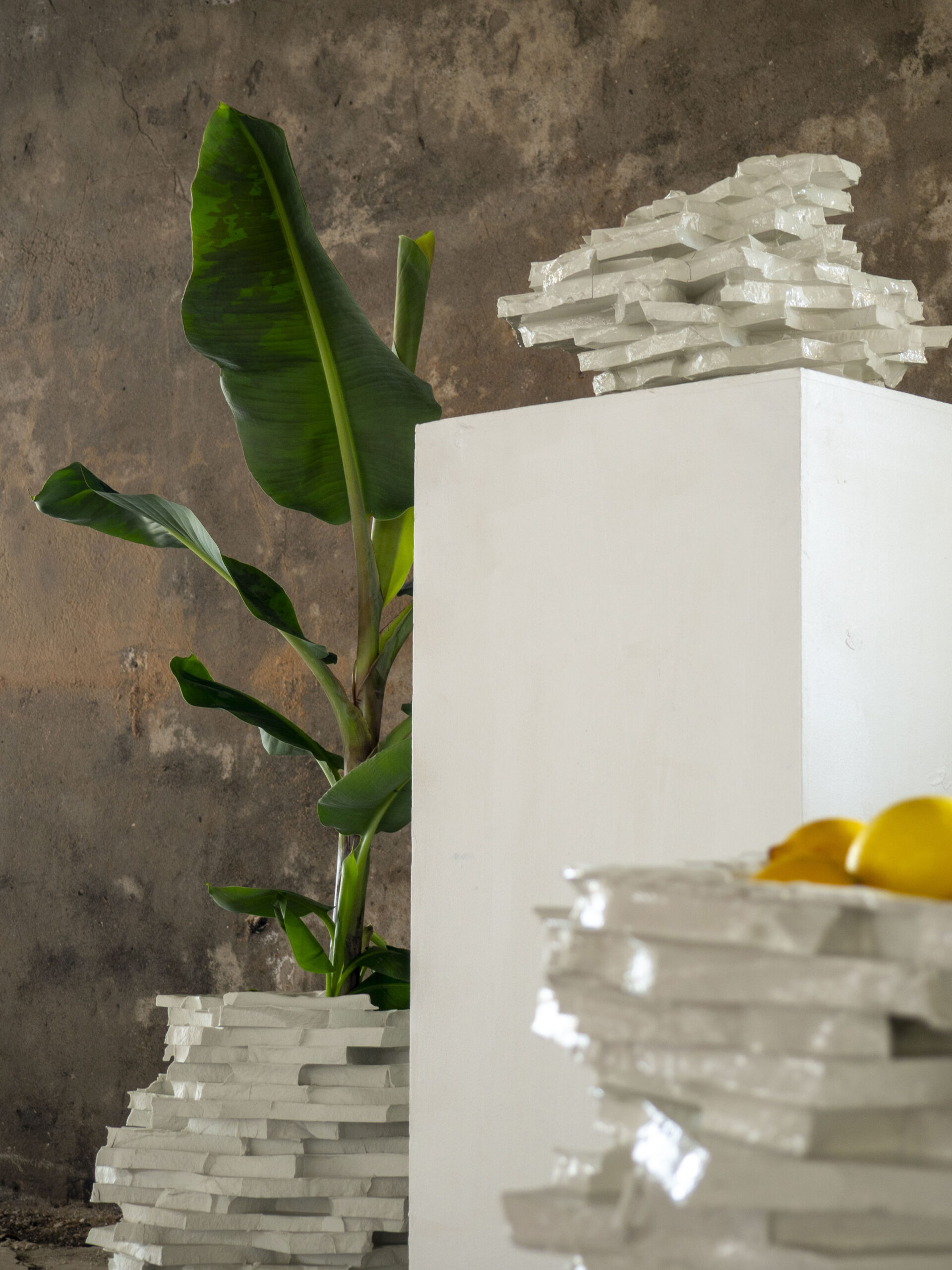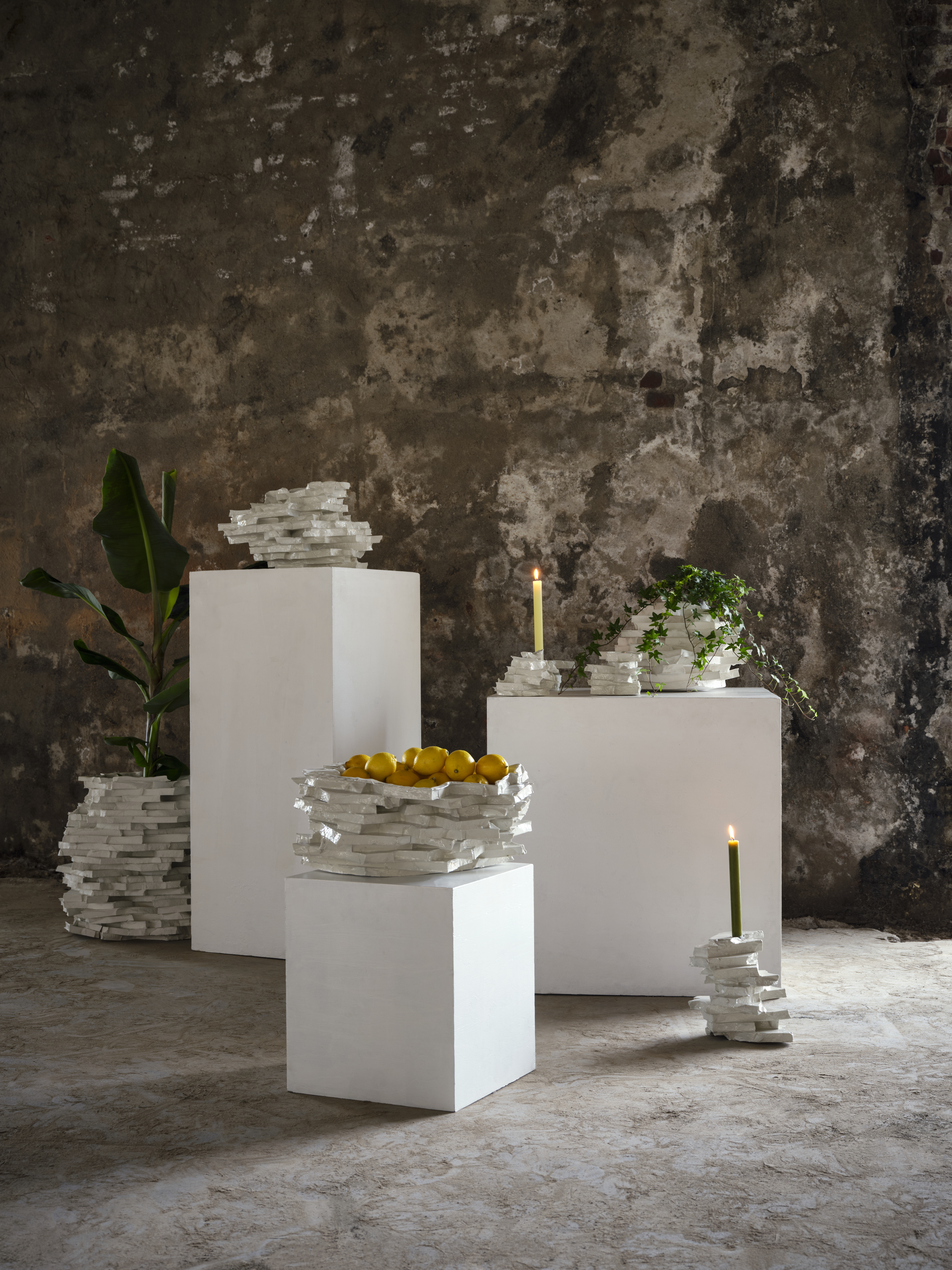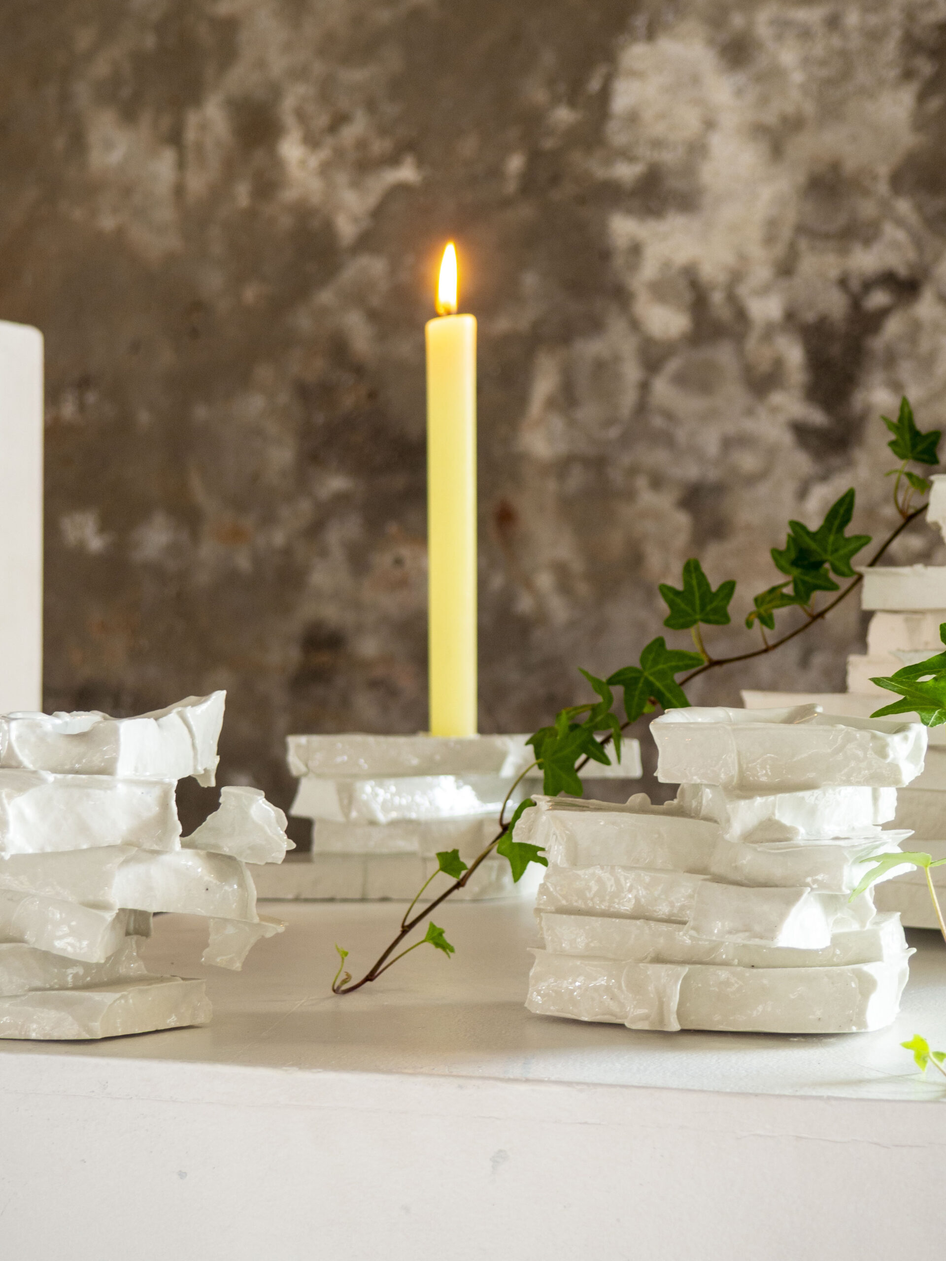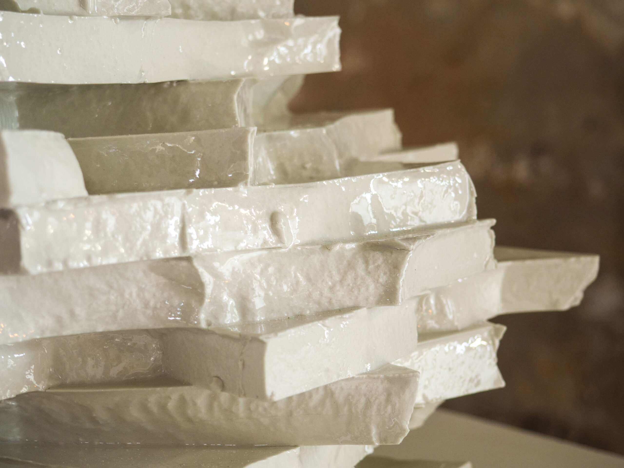 Instead of a methodical, seamless preparation, the plaster blocks are cast solid, layered, and intentionally fractured. This disruption introduces a dose of randomness, resulting in a collection of distinct, unconventional parts. The final form is assembled differently each time by reconfiguring and stacking these pieces — 1511 in total. Some fragments are omitted, leaving voids that are subsequently filled with porcelain, resulting in a unique composition.