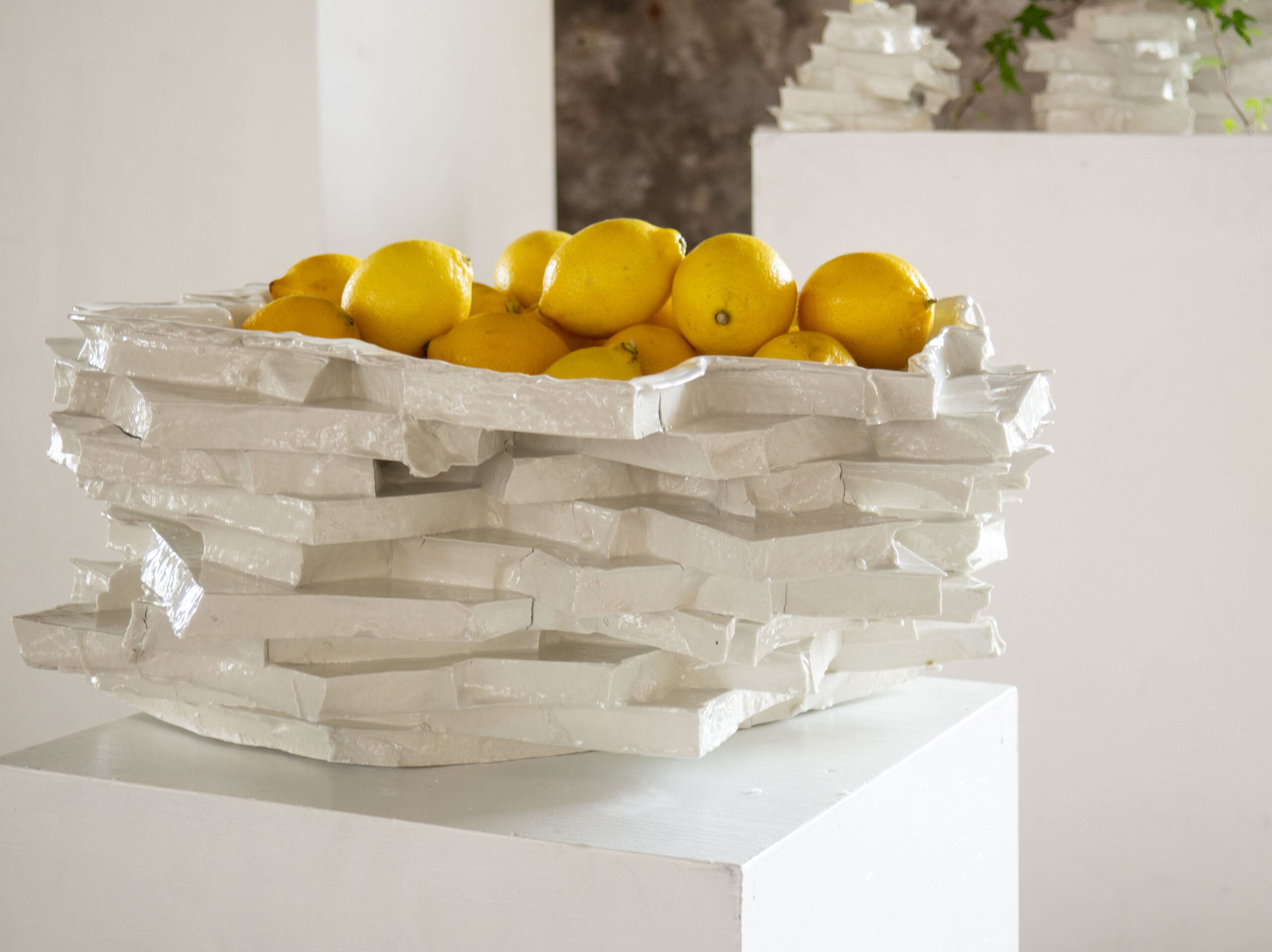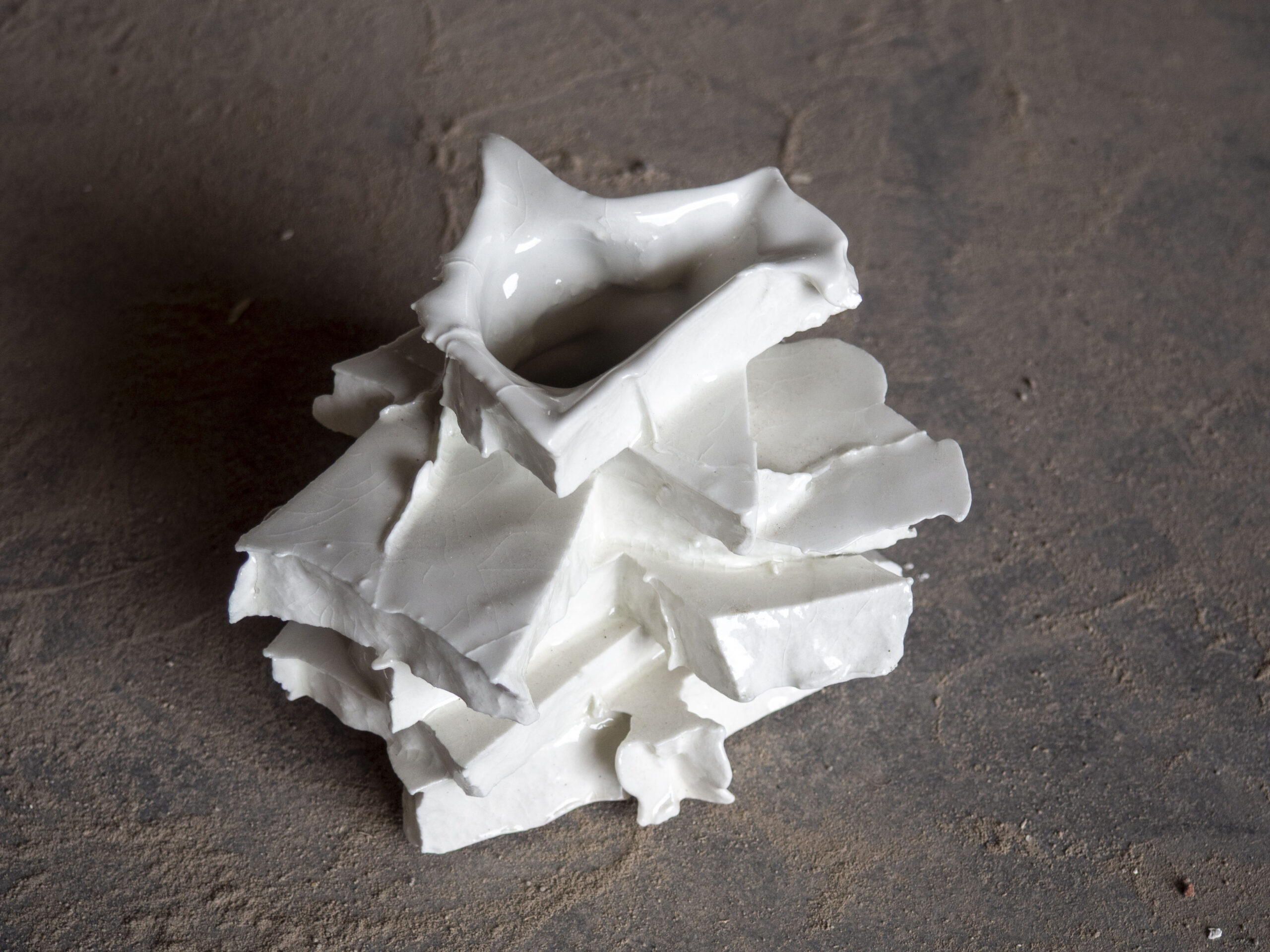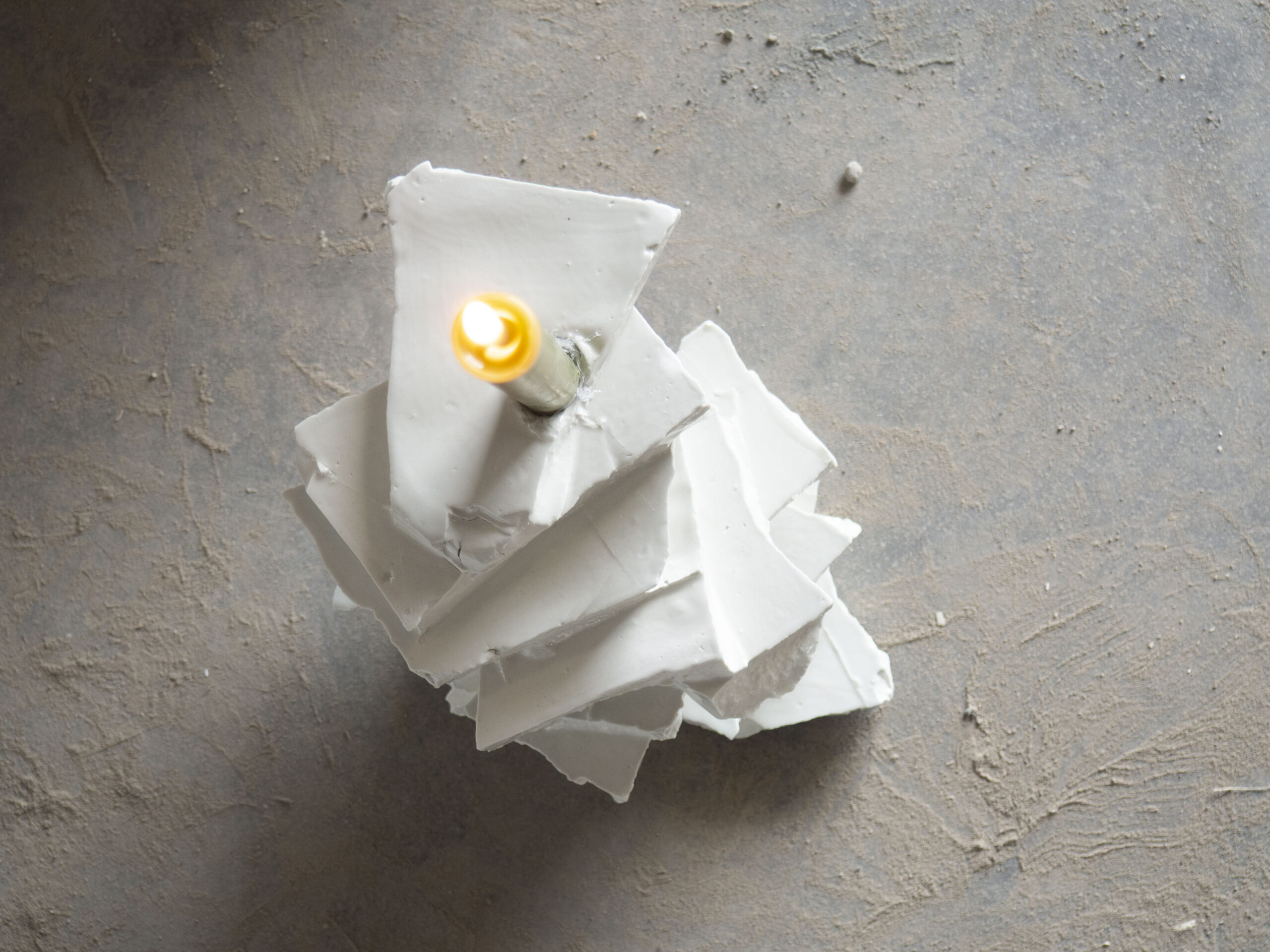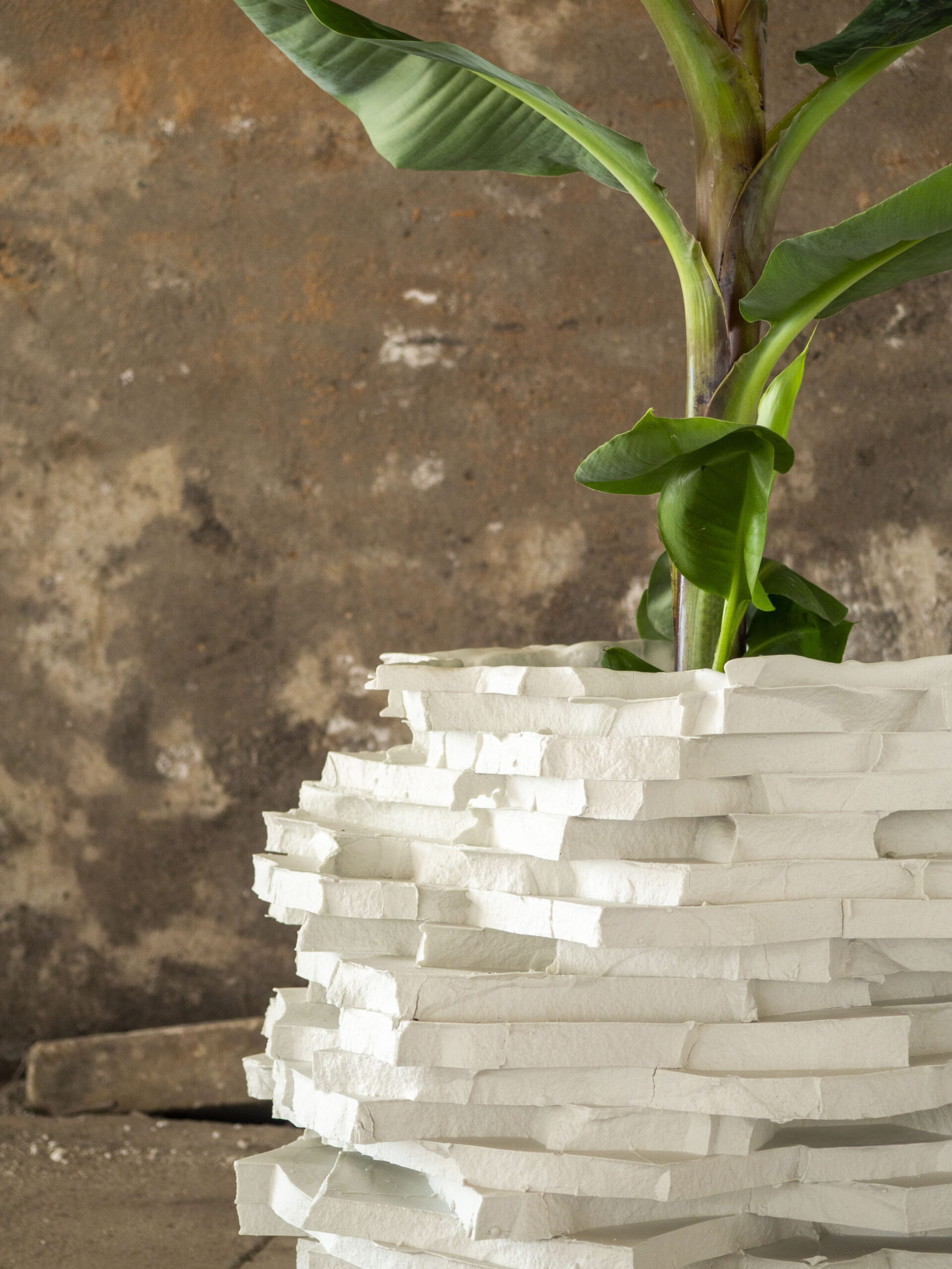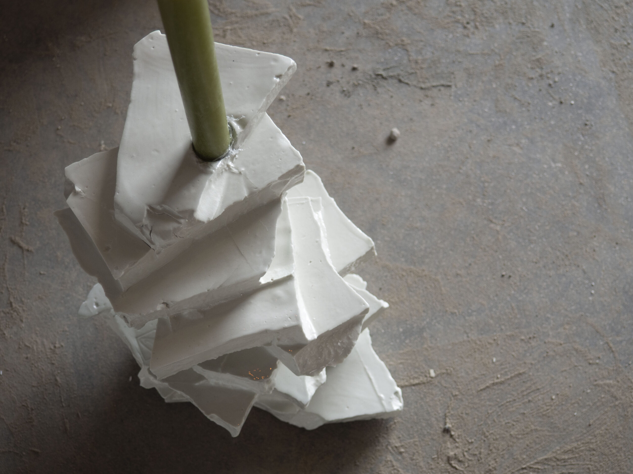 Instead of a methodical, seamless preparation, the plaster blocks are cast solid, layered, and intentionally fractured. This disruption introduces a dose of randomness, resulting in a collection of distinct, unconventional parts. The final form is assembled differently each time by reconfiguring and stacking these pieces — 1511 in total. Some fragments are omitted, leaving voids that are subsequently filled with porcelain, resulting in a unique composition.