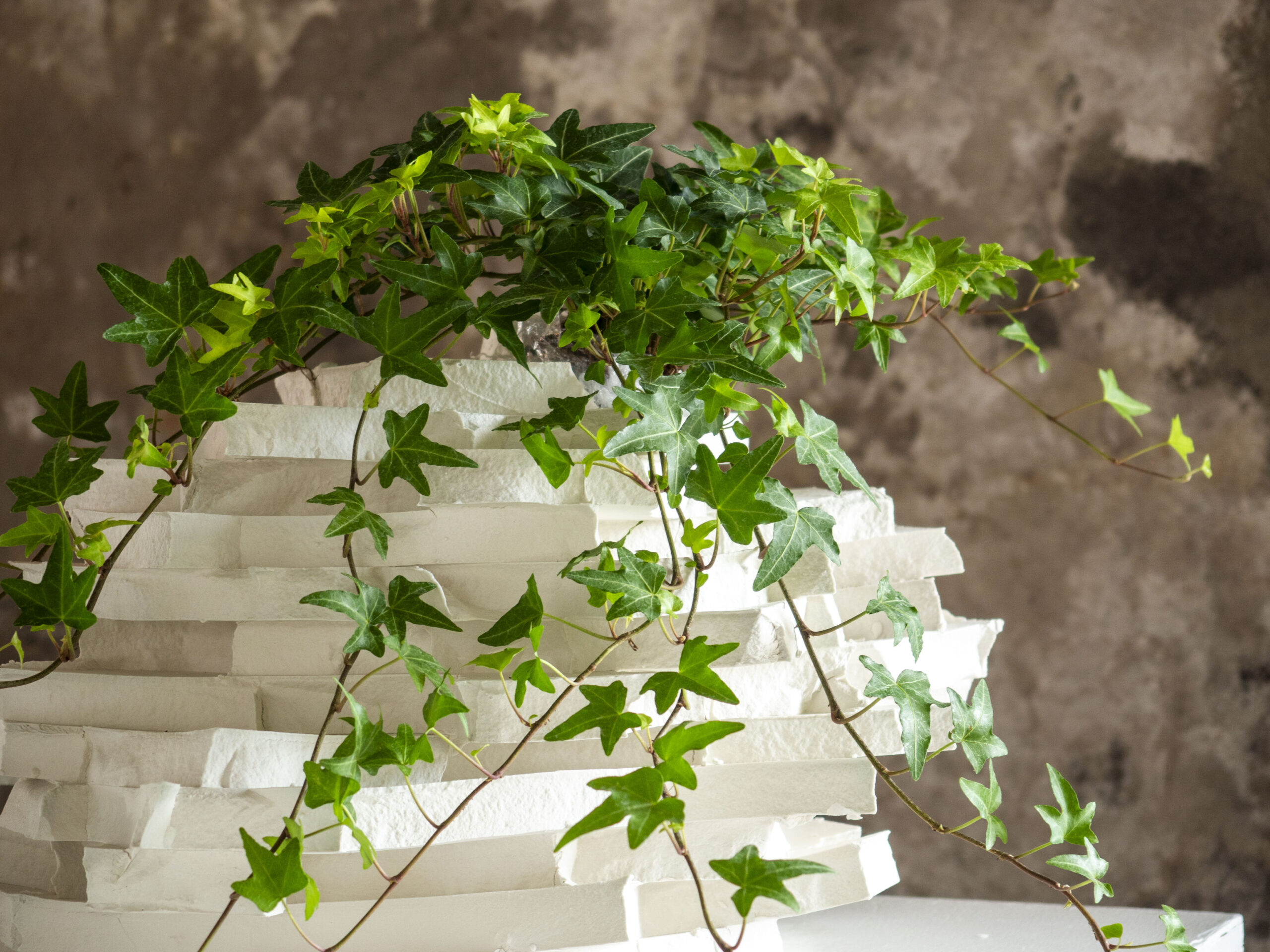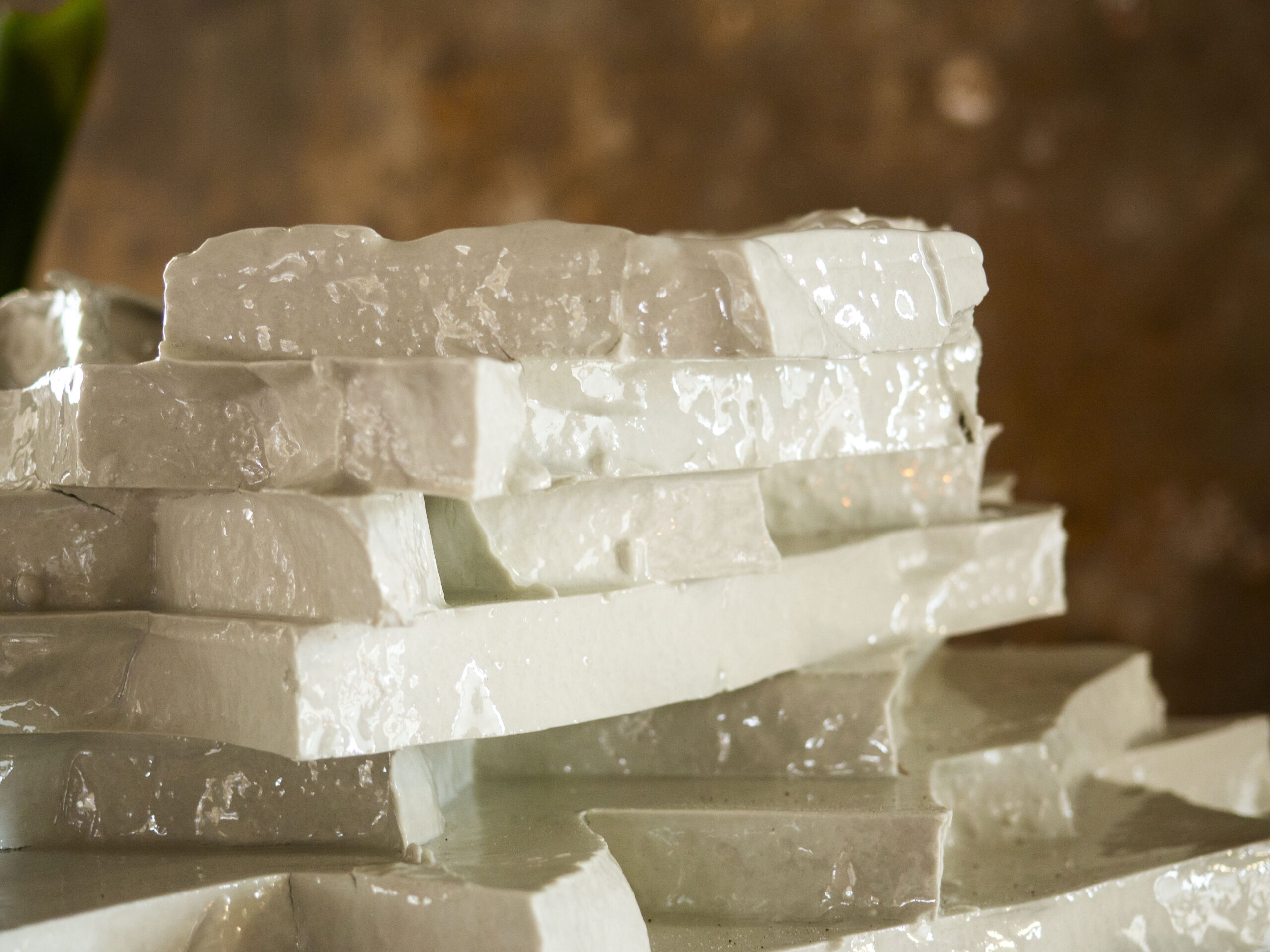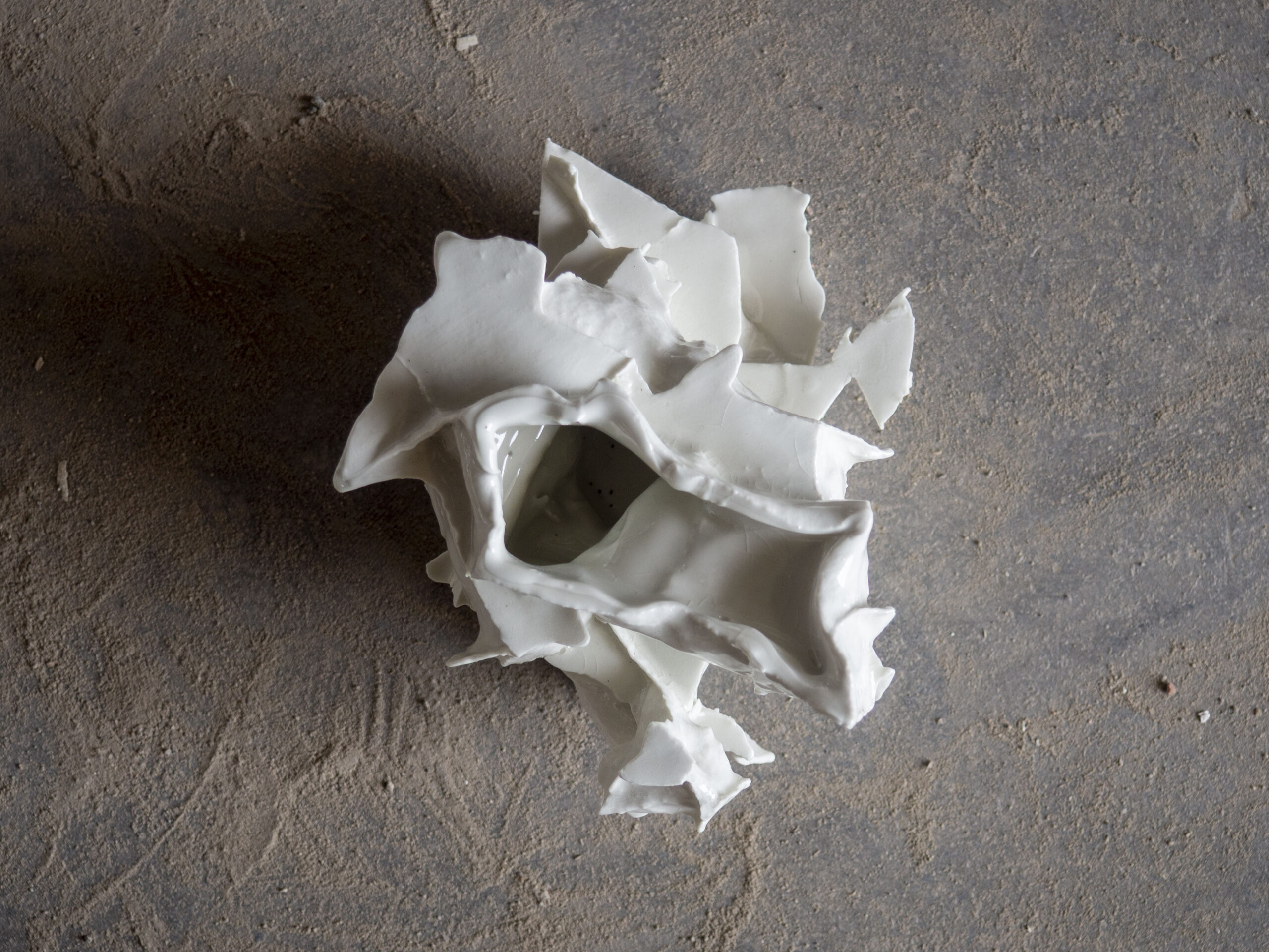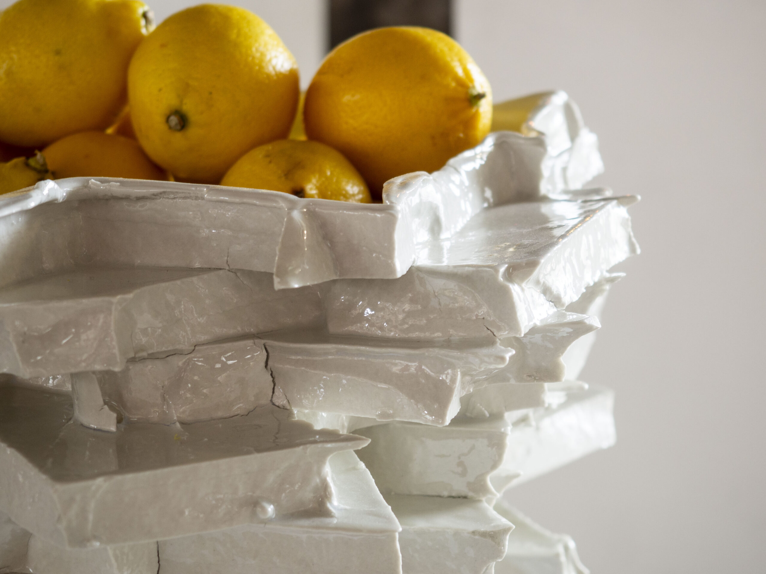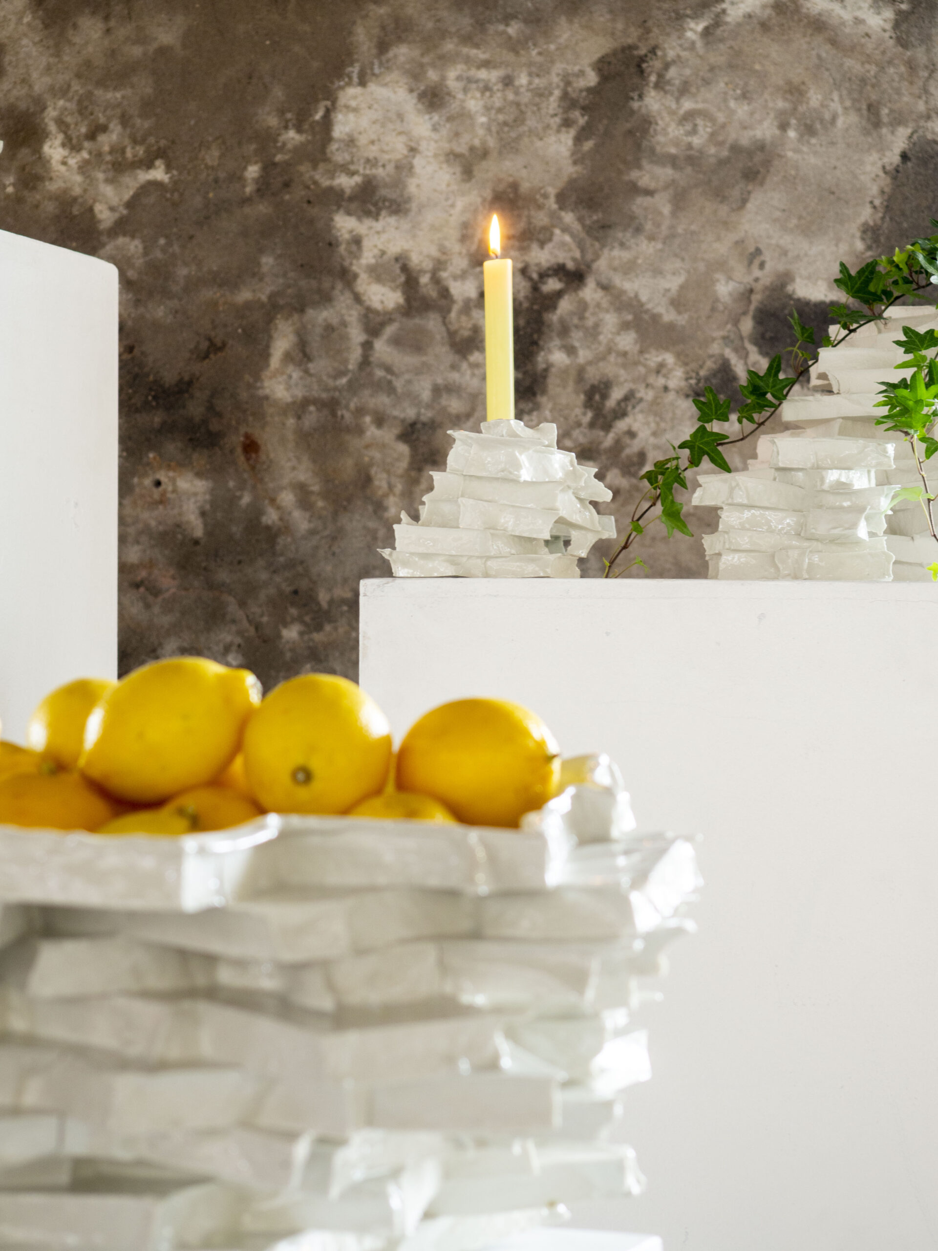 Instead of a methodical, seamless preparation, the plaster blocks are cast solid, layered, and intentionally fractured. This disruption introduces a dose of randomness, resulting in a collection of distinct, unconventional parts. The final form is assembled differently each time by reconfiguring and stacking these pieces — 1511 in total. Some fragments are omitted, leaving voids that are subsequently filled with porcelain, resulting in a unique composition.