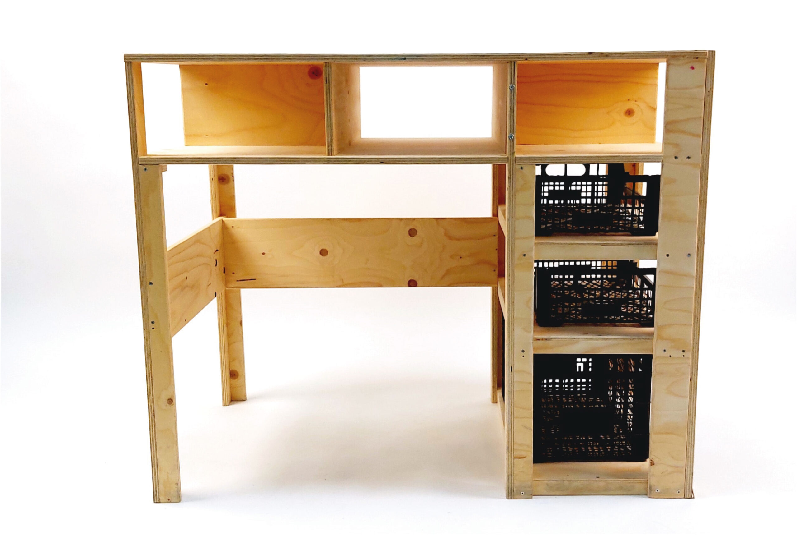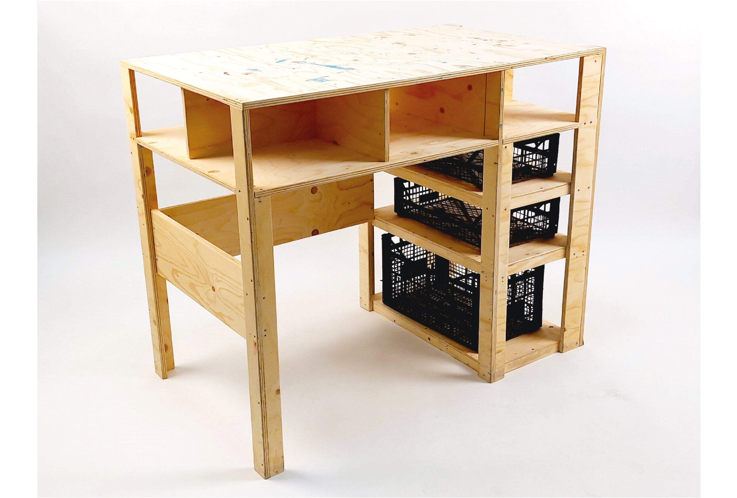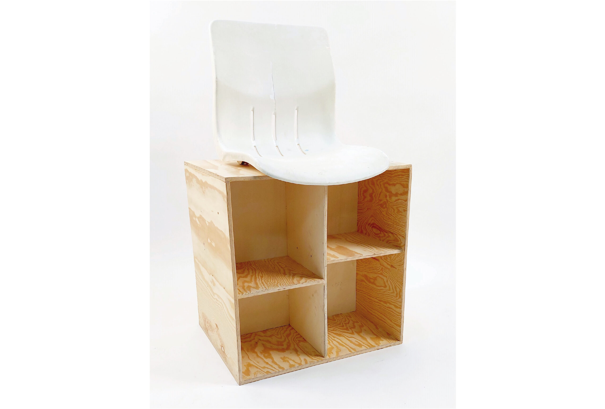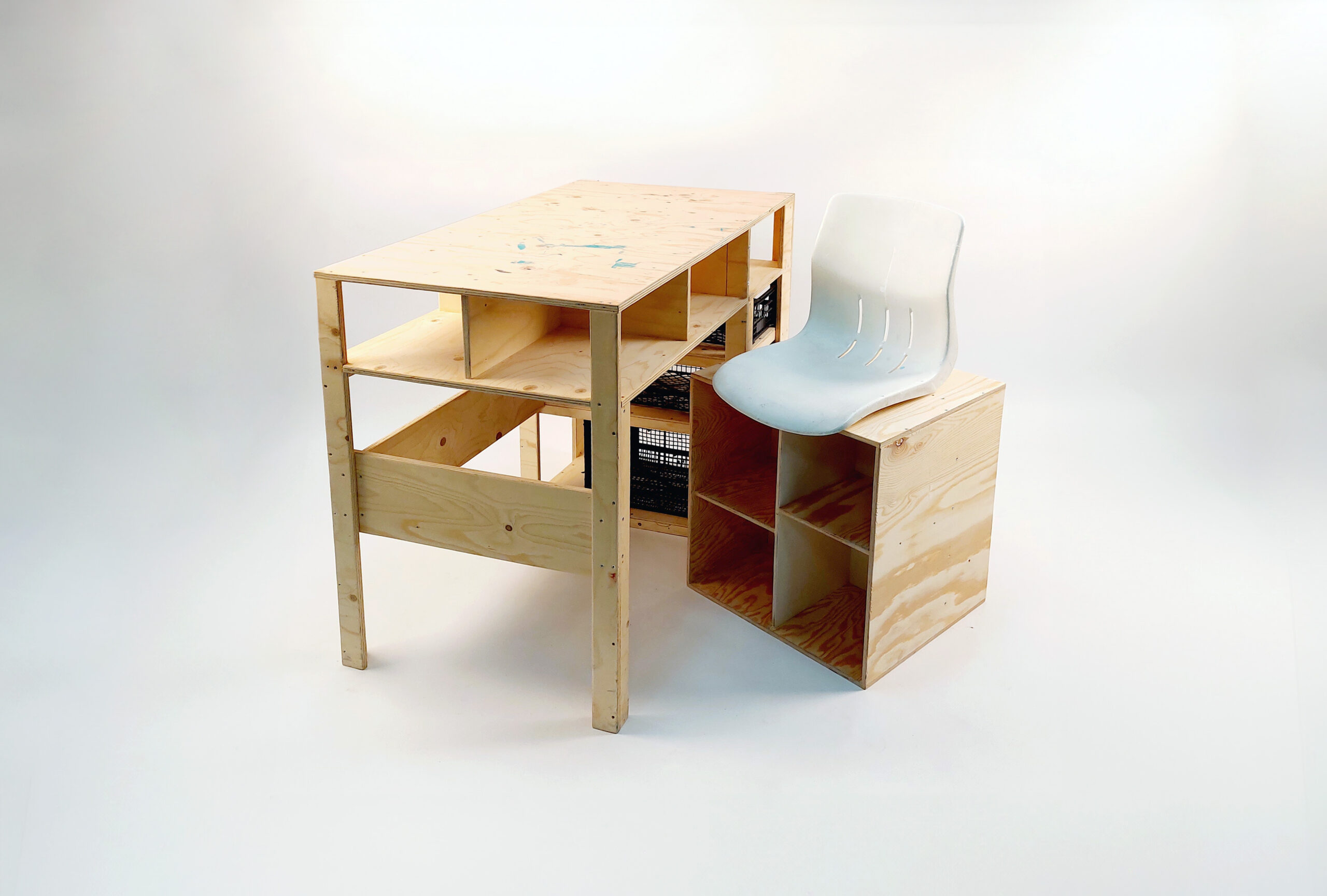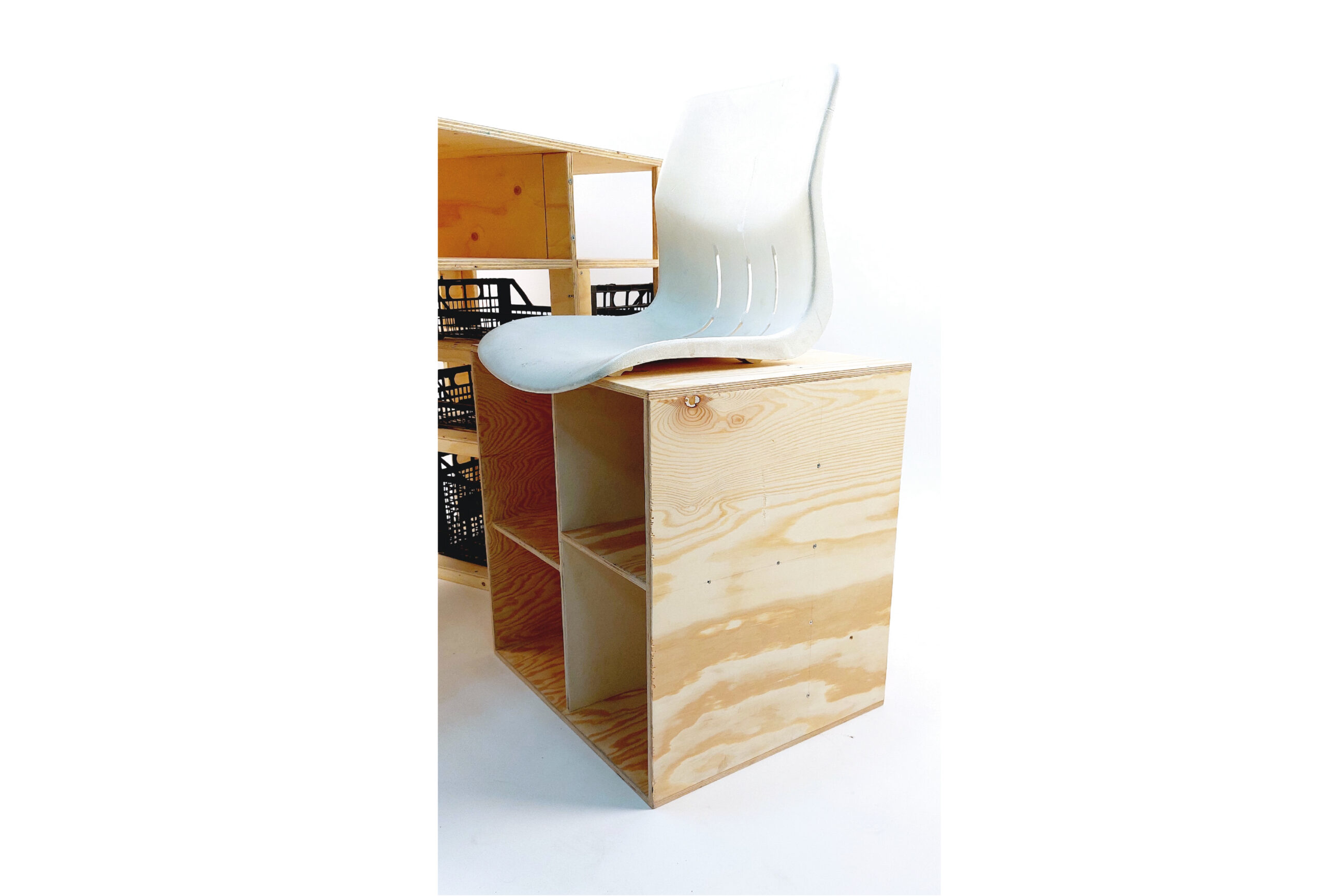 The materials used for the pieces is plywood, and the second-hand plastic additions: the crates and the seat. I purposely left the surface unvarnished, so over time the object would get the “patinated” look.